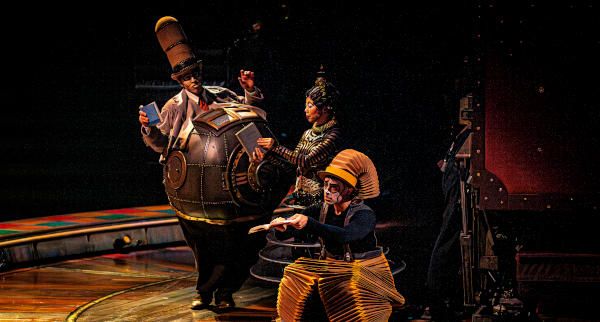 Au début du spectacle, un prolongement du manteau de M. Microcosmos se déploie en une locomotive d’où jaillit un essaim de voyageurs du XIXe siècle.
